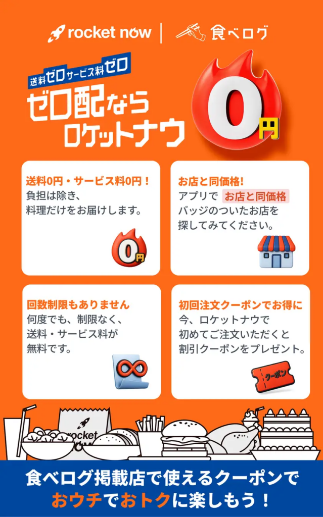 ロケットナウは、送料とサービス料が無料のフードデリバリーサービスです。和食、洋食、ヘルシー志向の料理など多彩なジャンルの料理からデザート、ドリンクまで迅速かつお得に楽しめます。最大4,000円分の初回注文専用クーポンセットもご用意しております。現在は関東(東京・神奈川・埼玉・千葉)、関西(大阪・京都・兵庫)、中部(愛知)を中心に展開し、急速にエリアを拡大しており、さらなる成長を目指しサービスを展開中です。