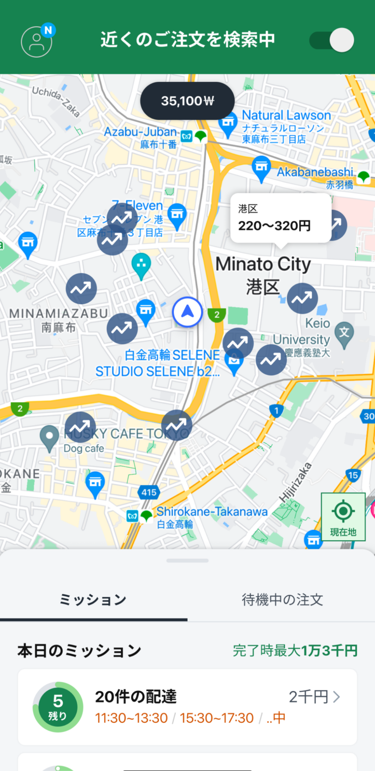 ホットスポットマーカーが表示された店舗の近くにいると、注文が割り当てられる確率が上がりますので、注文の割り当てが来ない場合はホットスポットマーカーが表示された店舗の近くに移動されることをおすすめします。